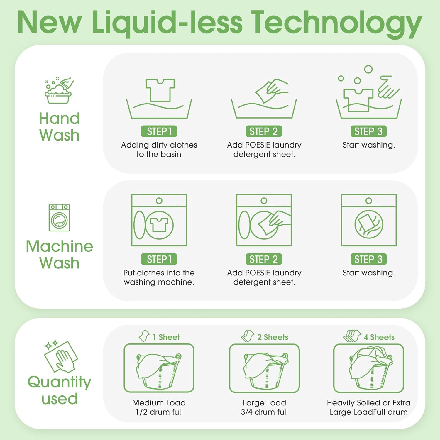 - Easy to Use - Liquidless detergent sheets, 1 sheet for small or medium loads where clothes are not very dirty, 2 sheets for large loads and 4 sheets for extra large loads, no waste. Not too little and not too much to save resources. Lighter Volume and Better Dissolving - the product is concentrated into a small piece, but has more powerful energy. And it can dissolve in water immediately, leaving your clothes fresh, clean and comfortable