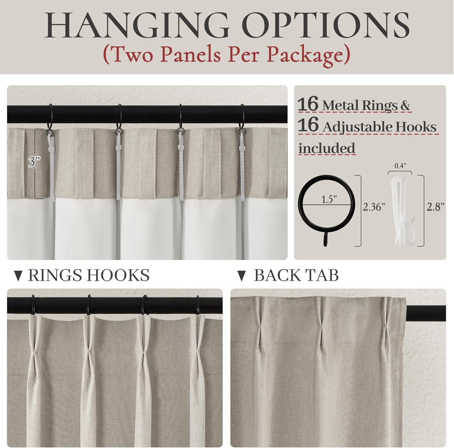 - Pinch Pleats Design:Each panel has 7 pleats.linen draperies are crafted from blended fabric(30%linen,70%polyester),drapes well and not easy-wrinkle.Suitable for various styles:modern,farmhouse,boho,neutral,bedroom,living room,nursery,sliding door,etc.