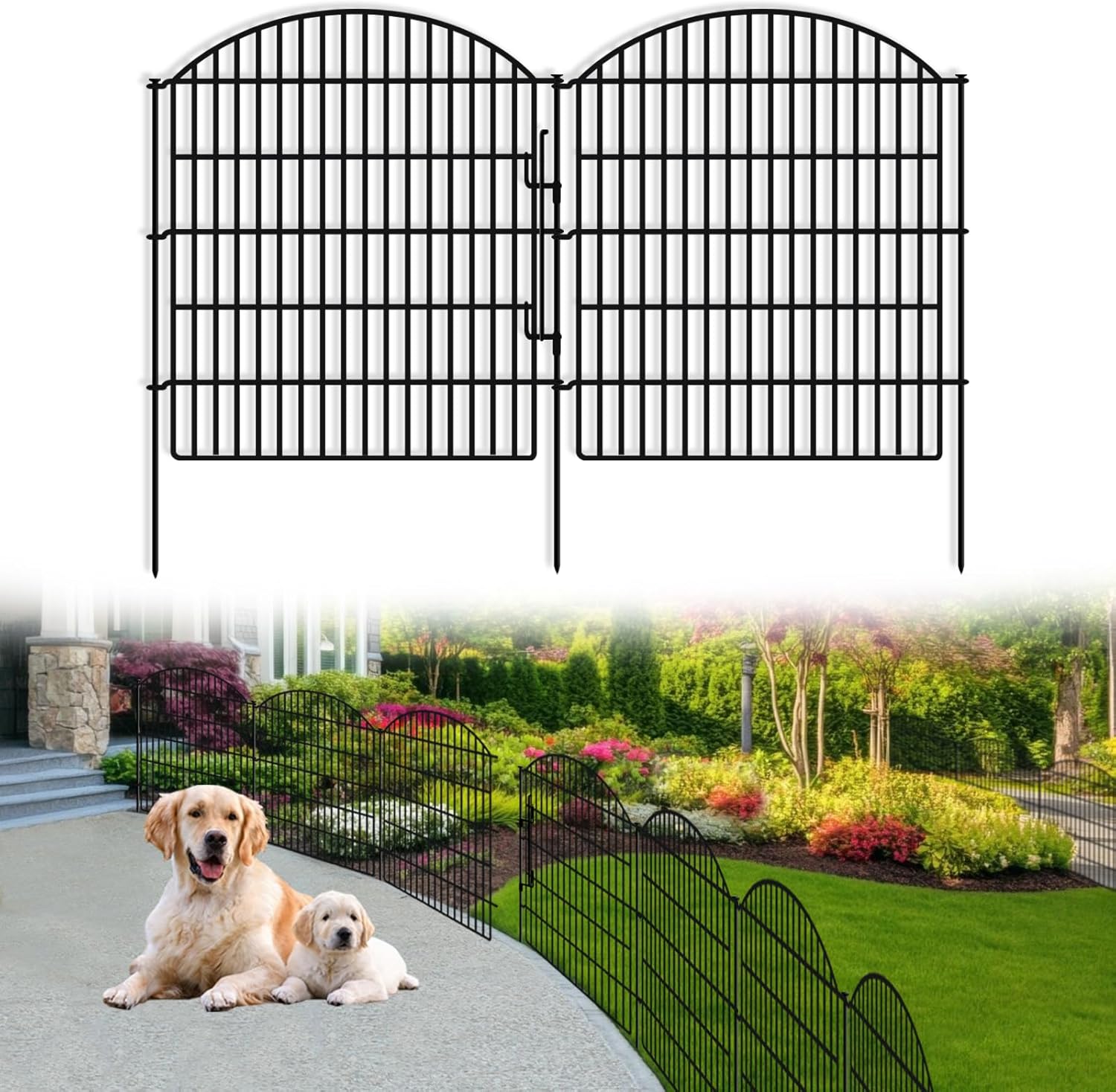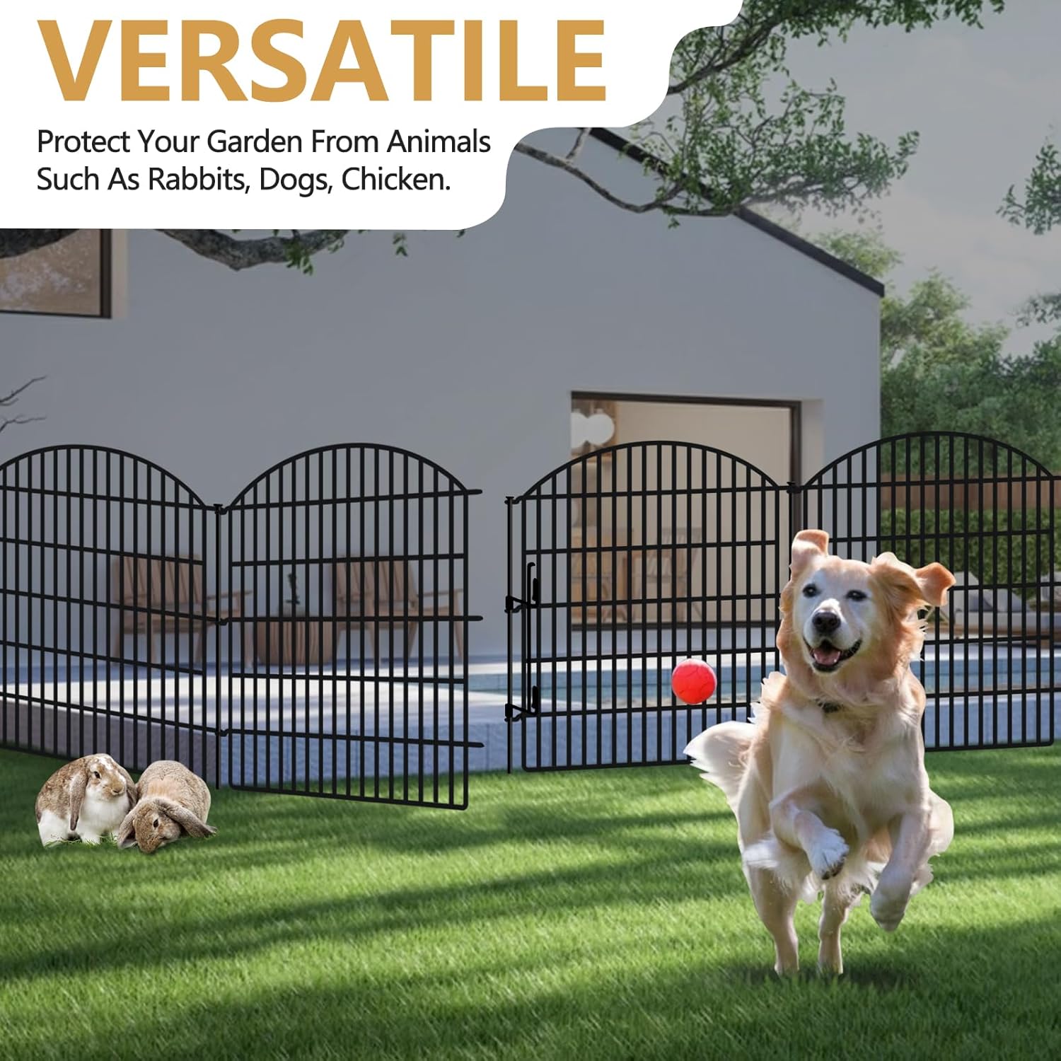 - MORE AVAILABLE SIZE: The classic arch shape design garden fence single piece measures 29" wide, 33" high, 1.4" gap. Comes with 17 metal stakes are 44" in height, which can be inserted into about 12.6 inches above the ground, making it strong enough to prevent animals from entering & leaving, dog digging, and even keep rabbits away from your plants. A total of 16 fence panels with a lock, connecting 17 fence stakes, the total length of the garden fence is approximately 38.67 ft.