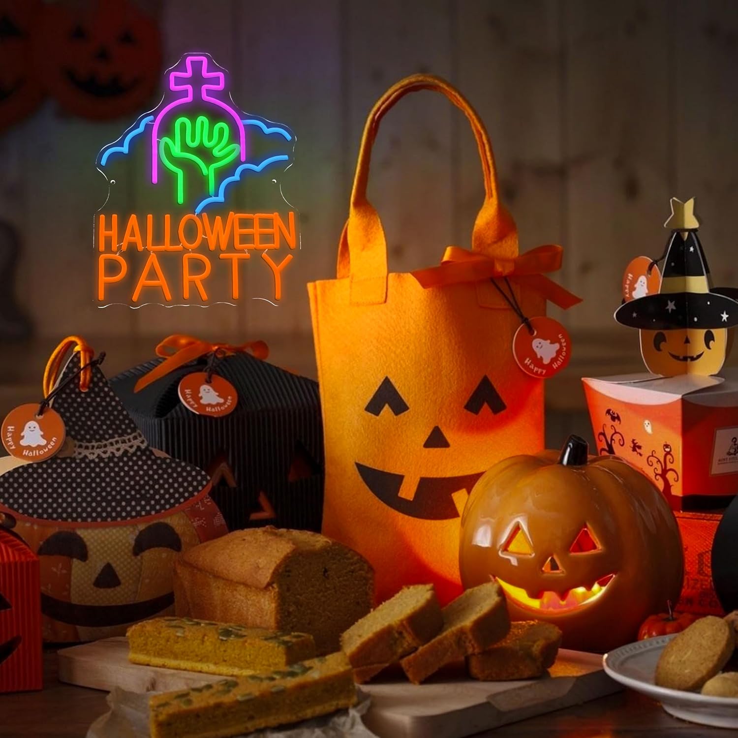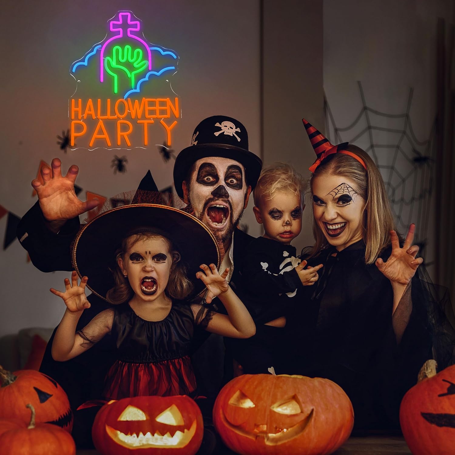 - Thrilling Atmosphere: As night falls, the Halloween party neon sign's tombstone emits an eerie purple glow like a gateway to the underworld, while the glowing green hand clawing from the earth whispers with its chilling green fingertips: "Welcome to the feast of ghosts."