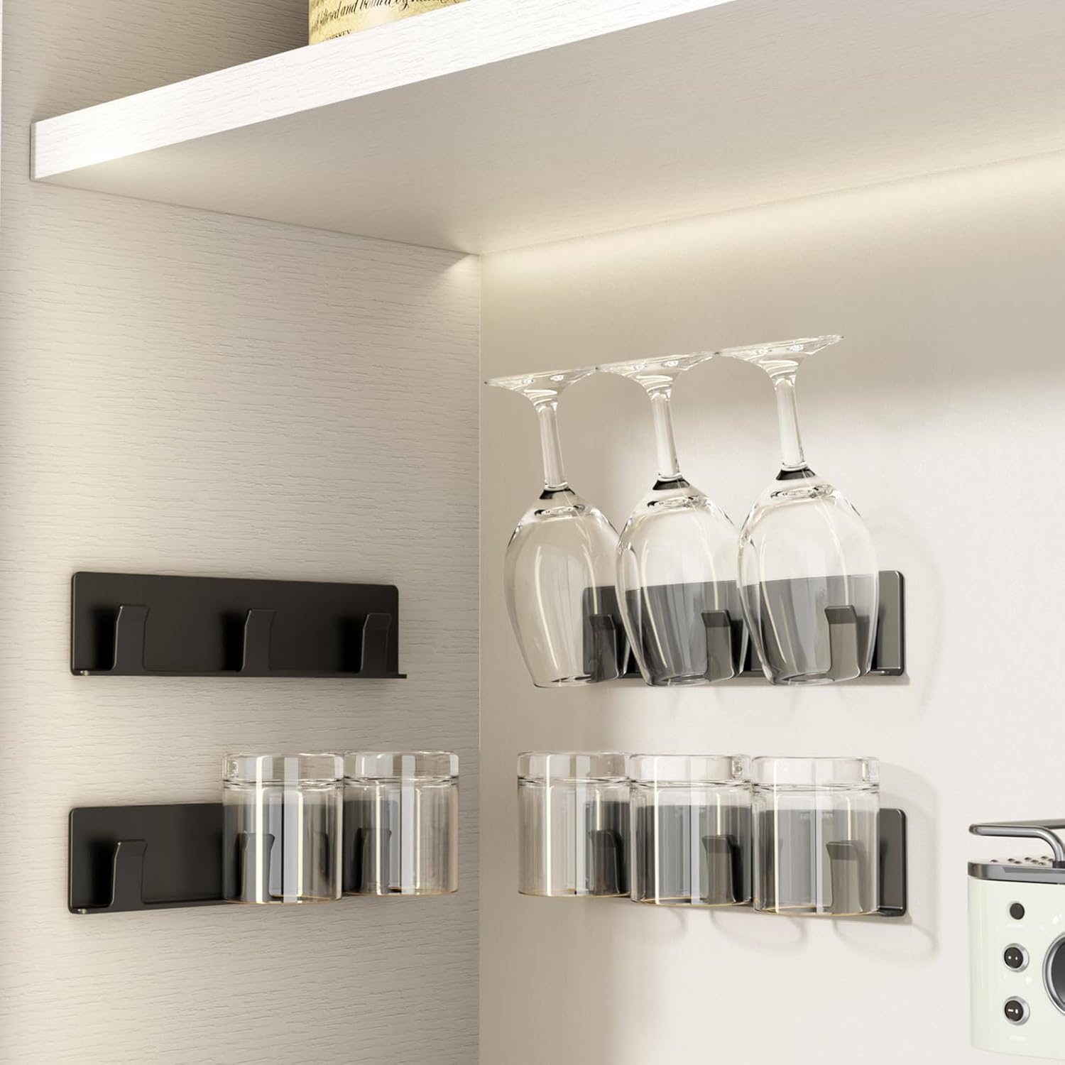 Cup Holder, 4 Pack Wine Glass Holder,No Drilling Installation Wine Glass Holder Wall Mounted for Dining Room, Kitchen and Bar Daily Use (Classic Black)
