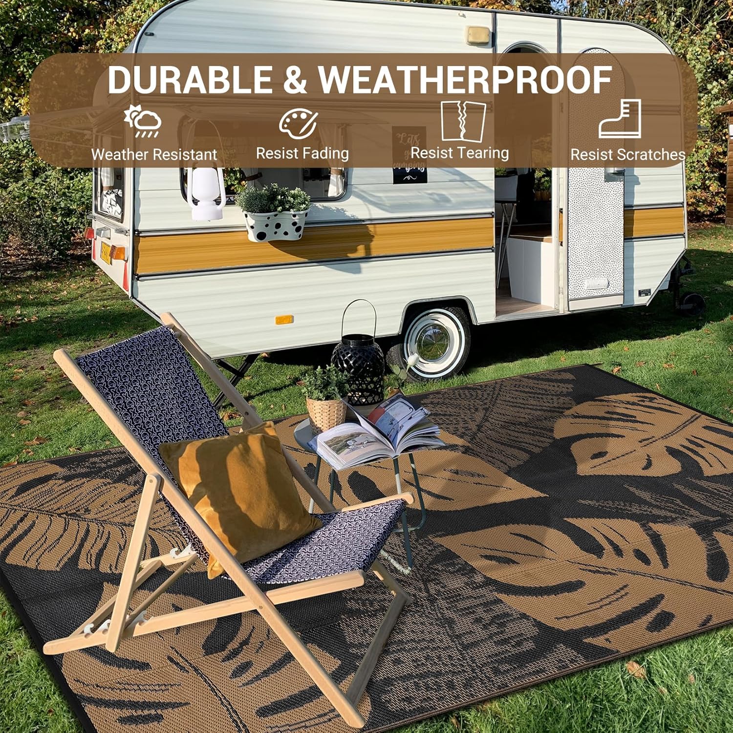 GAOMON Outdoor Rug Waterproof 9x12 Outdoor Plastic Straw Rug for Patio, Reversible Modern Camping Mat with Bag & Stakes, UV Resistant & Easy to Clean Carpet for RV, Deck, Balcony, Porch, Brown