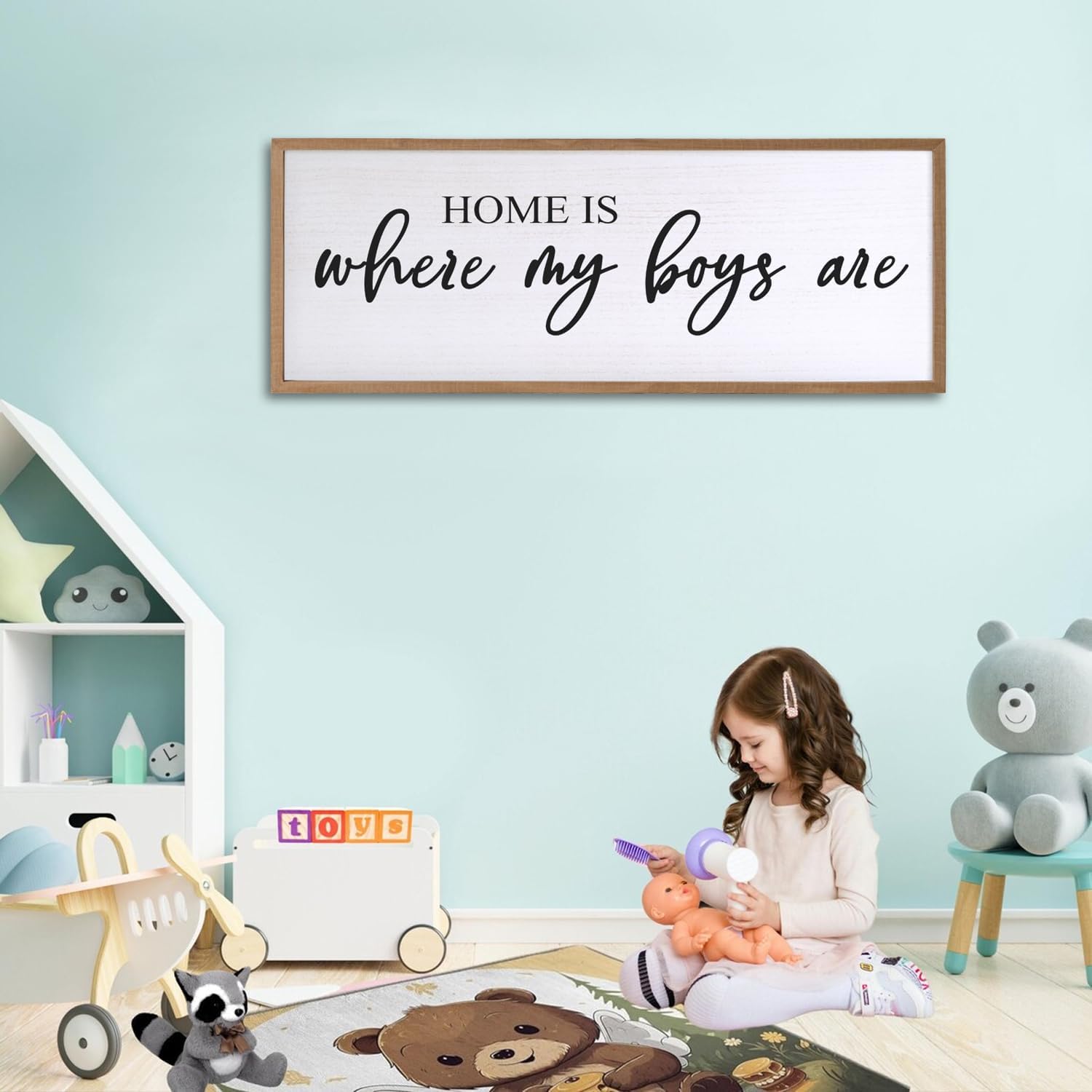 Home is Where My Boys are Sign Framed Wall Art, 40''×15'' Rustic Horizontal My Son Plaque with Natural Frame for Baby Kid Boy Son Teen Toddlers Room, Horizontal Mom of Boys Gifts Nursery Decor