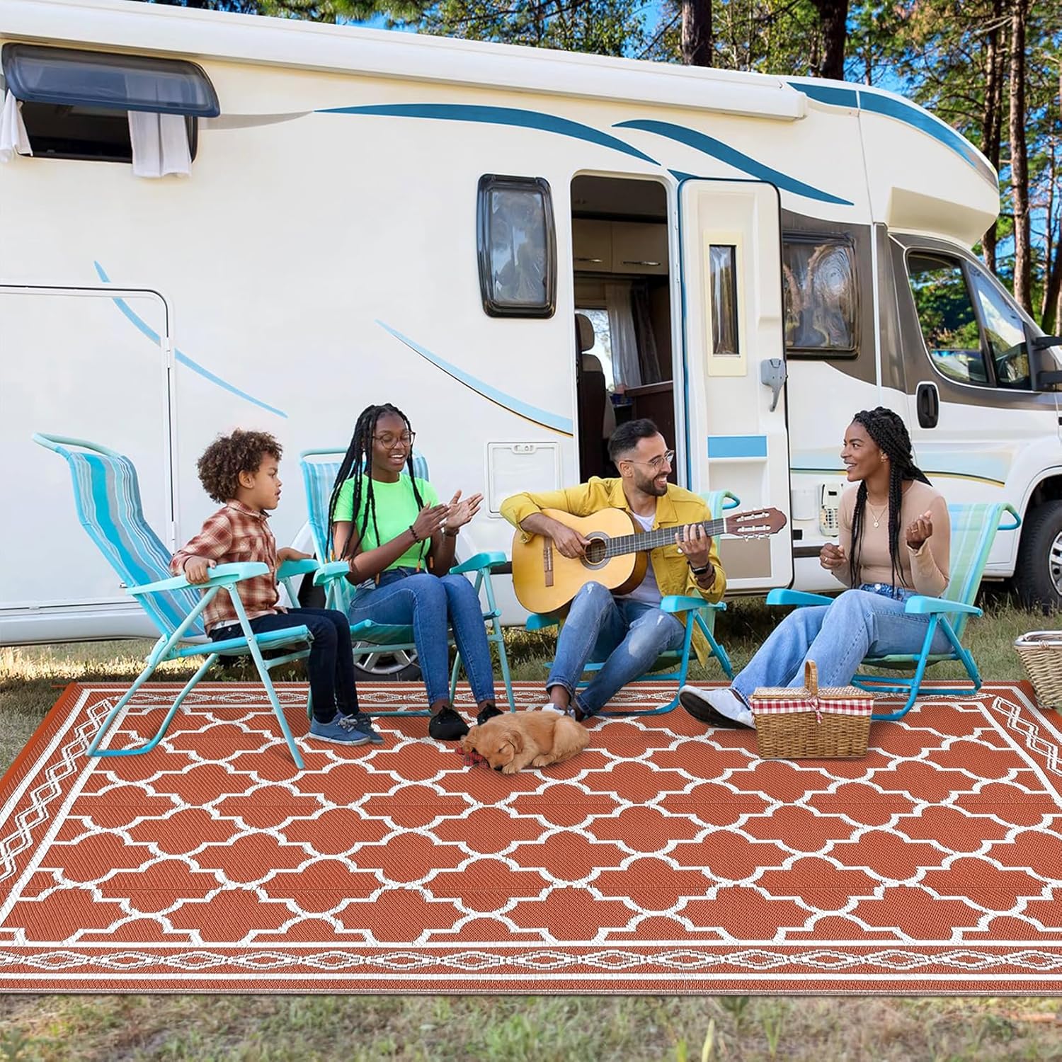 GAOMON Outdoor Rug Waterproof 8'x10', Reversible Outdoor Plastic Straw Rug, Boho Patio Rug, Indoor Outdoor Carpet, RV Mat Outside for Patio, Camp, Picnic, Balcony, Deck, Orange/White(Geometric)