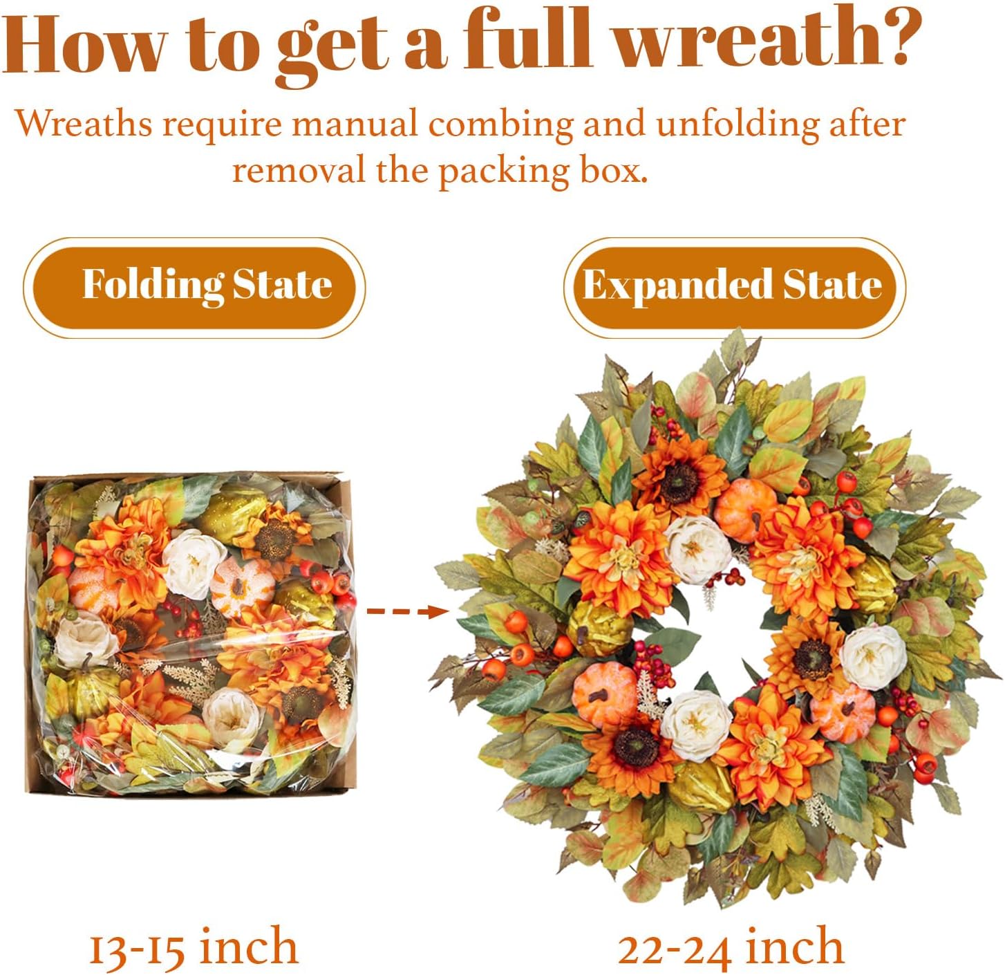 - đŸăDurable Craftsmanship with Realistic TextureăHandcrafted with premium silk flowers and textured artificial foliage, every flower, fruit, and leafâwhether dahlia, pumpkin, eucalyptus, or oakâis securely attached to prevent falling or fraying. Built to withstand seasonal use both indoors and under covered outdoor areas, this wreath keeps its vibrant color year after year.