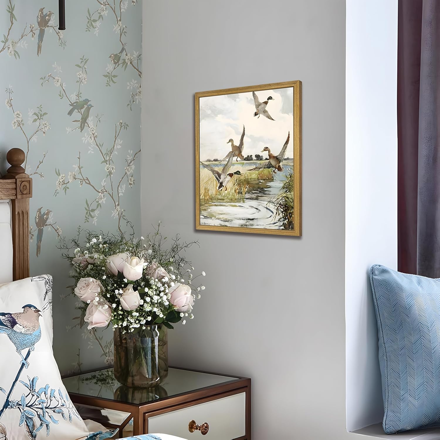 - Timeless Vintage Wildlife Artwork Features a beautifully detailed watercolor illustration of mallard ducks in flight over a peaceful marsh. This classic design blends poster appeal with artist-quality paintings, perfect for fans of wildlife art, vintage decor, and rustic living.