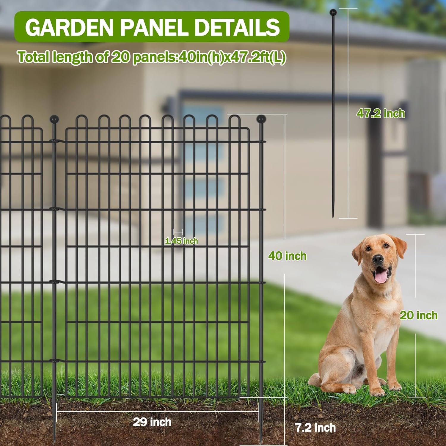 20 Panels No Dig Decorative Garden Fence with Gate for Yard, 40 in(H) X 47.2 ft(L) Animal Barrier Fencing for Outdoor Dog, Metal Portable Garden Fences for Borders, Pets, Landscape, Temporary Fence