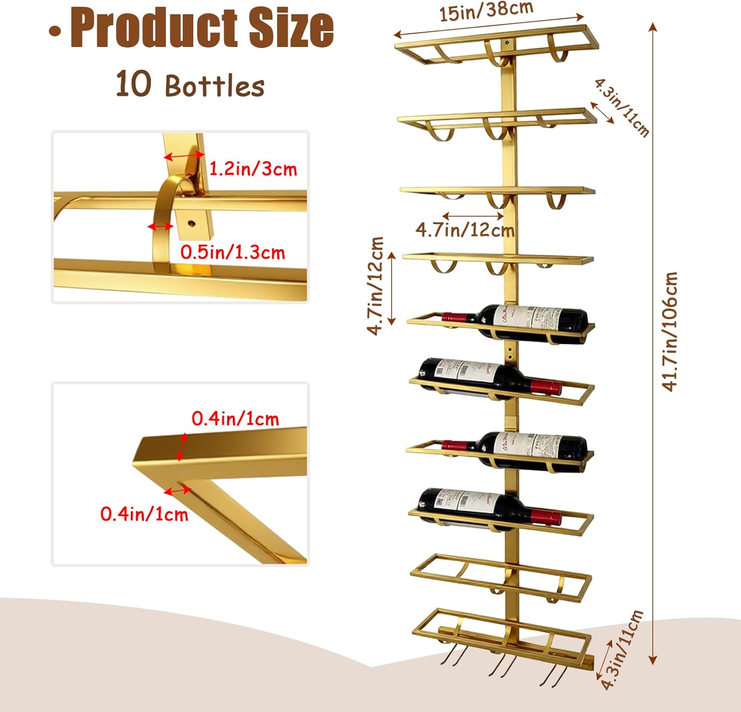 - Prevents Bottles from Falling: The wine glass rack wall mounted comes with a bottom bracket that is 0.5in/1.3cm wide, and each tier of wine shelf is supported by three bottom brackets to ensure that large and small bottles can be placed safely and attractively