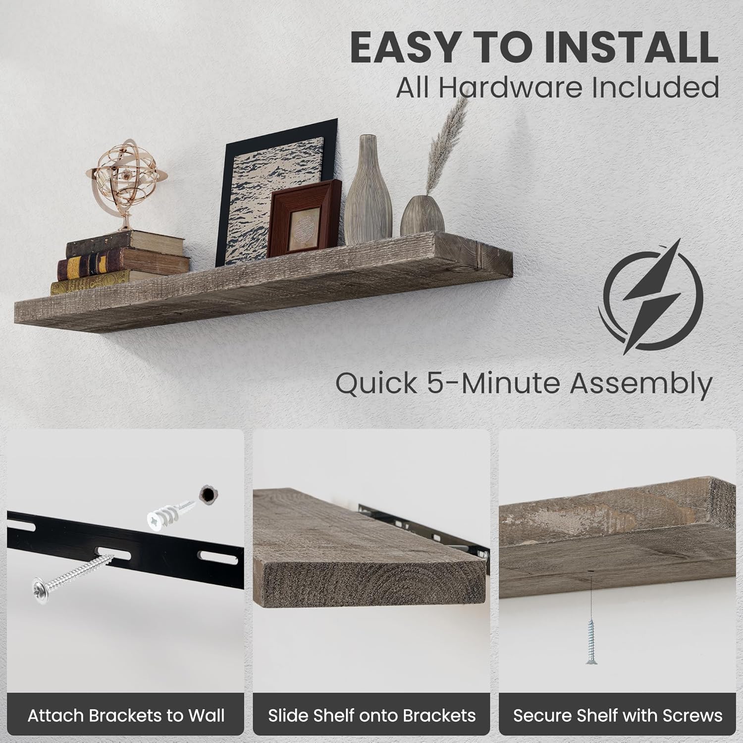 - Easy to Install - Our hanging floating shelves come with easy-to-follow installation instructions, two hand-crafted reclaimed wood shelves, two metal brackets, screws, anchors, and a level. Our dedicated customer support team is always available to assist with any questions or concerns