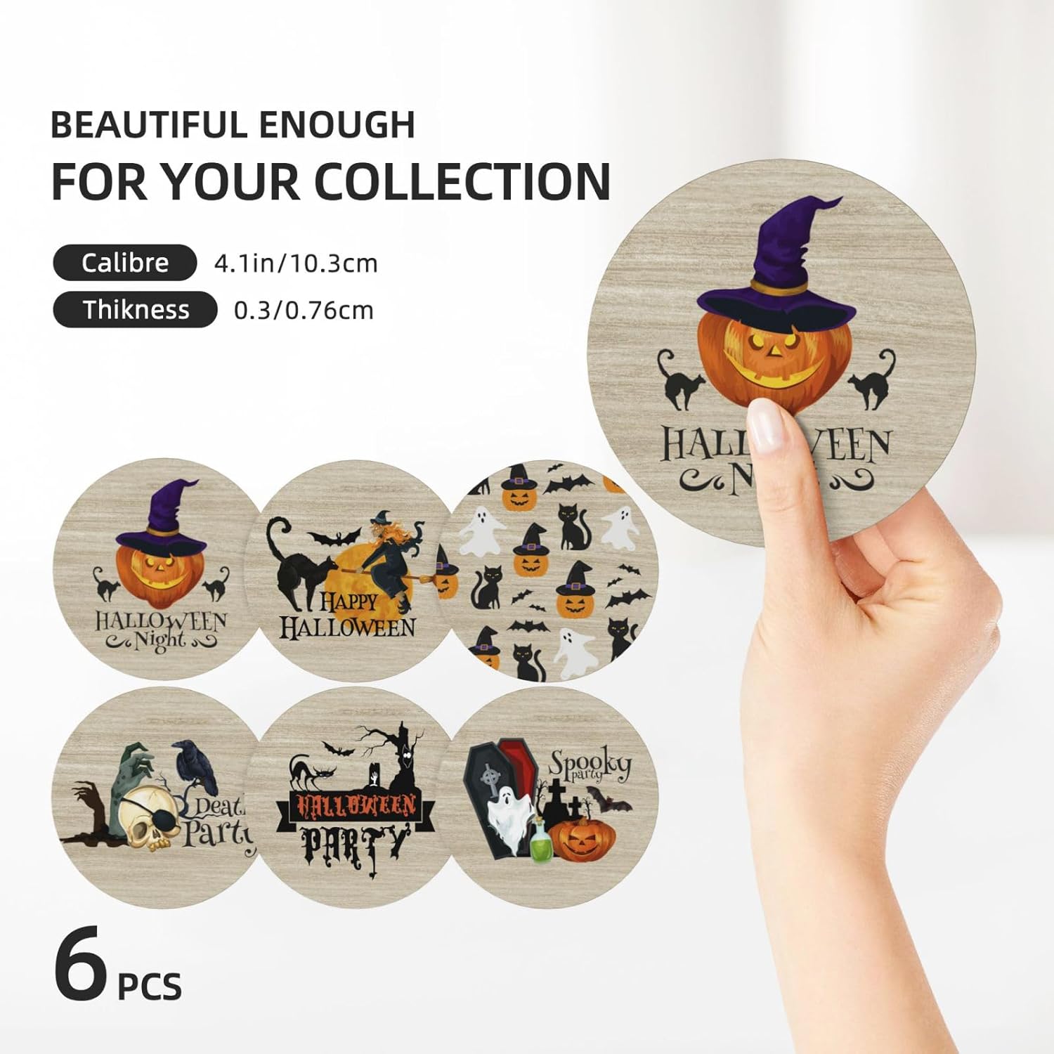 Halloween Coaster for Drinks Set of 6 with Metal Holder and Cork Base Ceramic Drink Coasters Absorbent Cup Mat Non-Slip for Home Kitchen Office Table Decor, 4 Inch