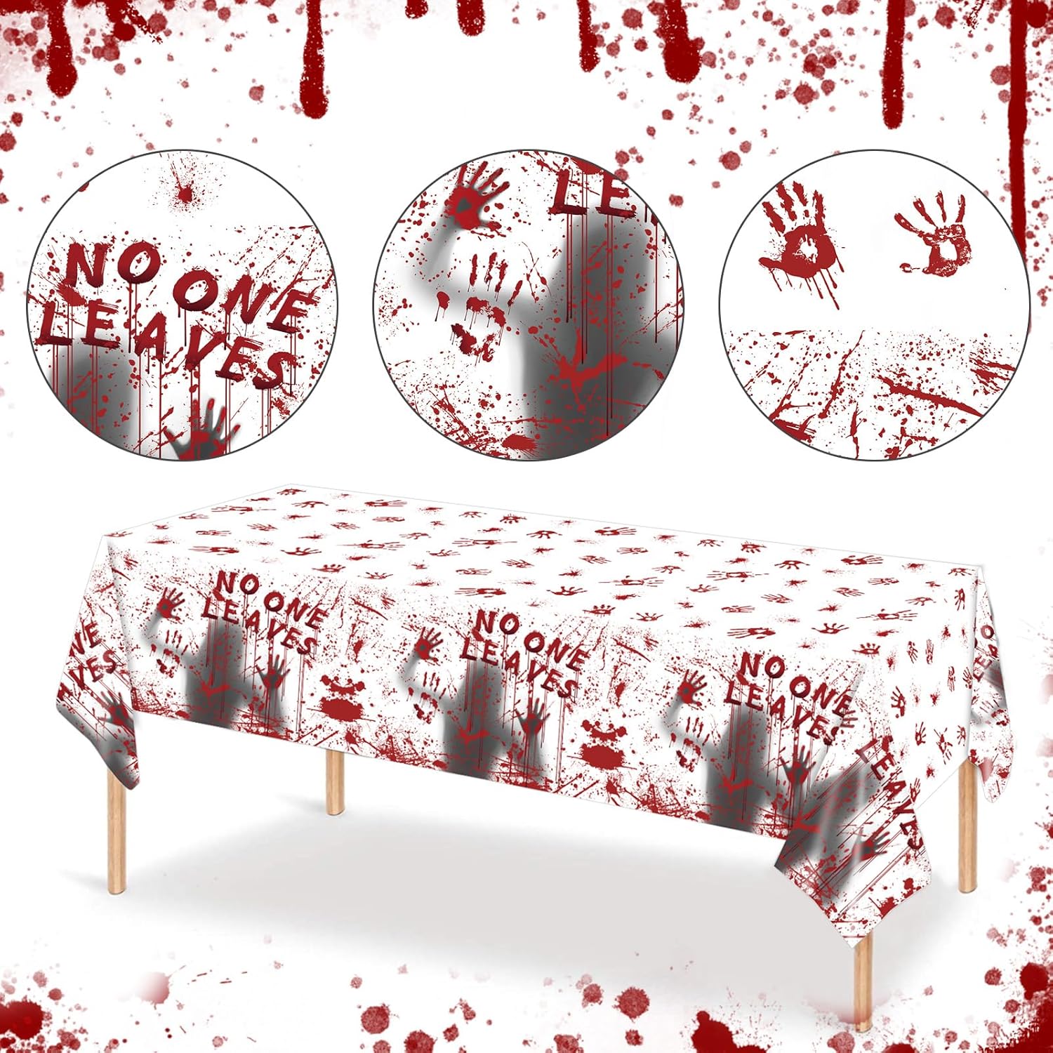- 【Spooky Bloody Handprint Designs】Elevate your Halloween decor with our tablecloths, each boasting a mix of spine-tingling and charming motifs: Blood handprints, blood stains, terrifying portraits. These designs strike the perfect balance between spooky and festive, instantly transforming any space into a Halloween wonderland—ideal for parties, trick-or-treat setups, or family gatherings.