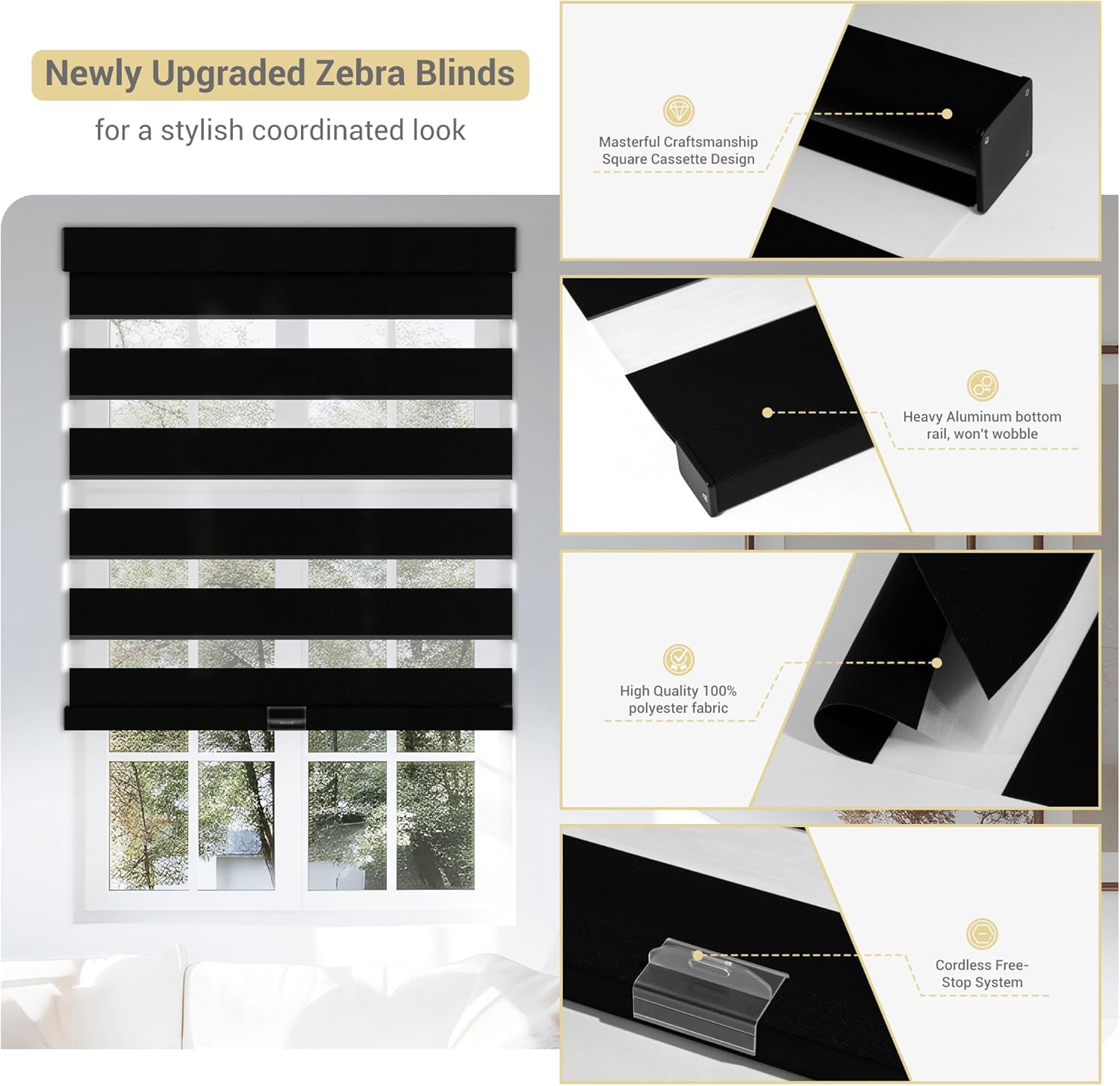 Cordless Zebra Blinds for Windows, Blackout Interior Blinds,Easy to Install,UV Protection,for Offices and Home,Custom Roller Shades, Solid Black, 80" W x 64" H
