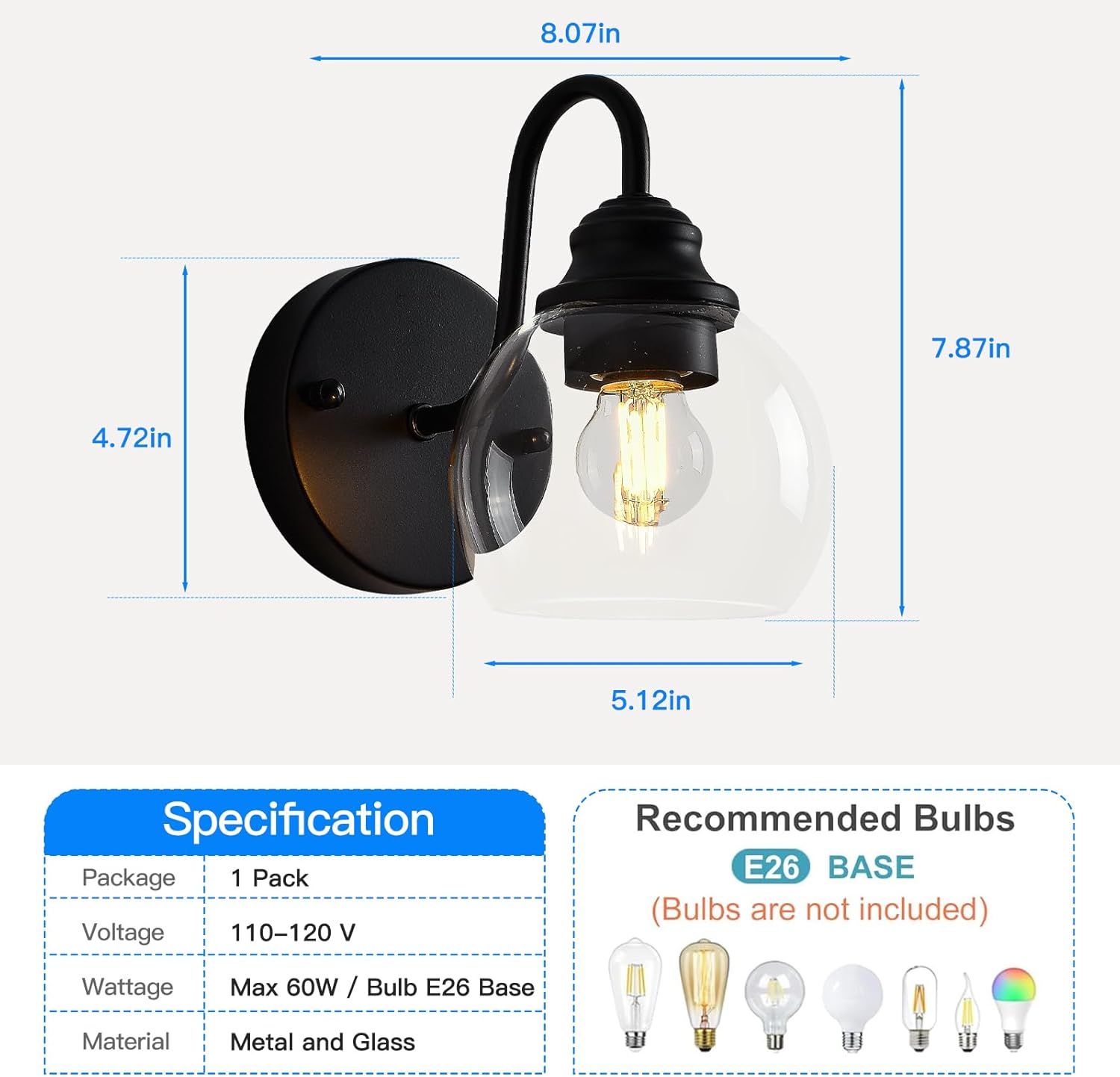 - ăStandard E26 Baseă: Our bath vanity light fixtures set require 2 x E26 medium base bulbs (Max 60W for each light, Bulbs not included). This wall lamp areCompatible with smart bulbs and dimming bulbs (without smart and dimming functions). 2700K warm white bulbs brings you relaxing and welcoming feeling, however 5000K daylight white bulb give you clean and energetic enjoyment (Max. 60W, Hardwire 120V)