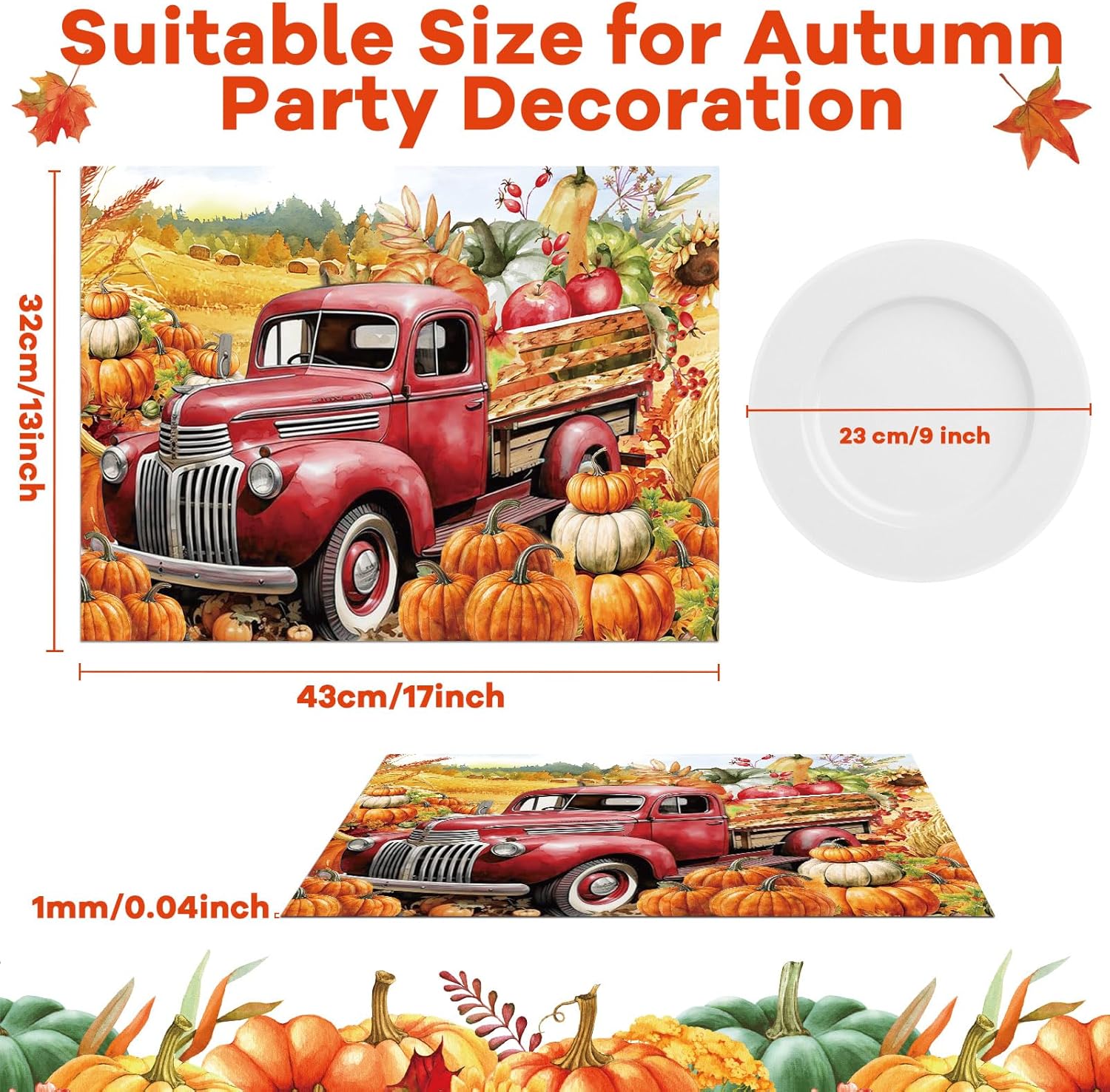 - Premium Material: Our fall harvest placemats are crafted from plastic. The Thanksgiving pumpkin placemats are waterproof, heat-proof and odorless, making the fall place mats durable and supporting long-term use. Also, the vibrant colors will remain bright over time
