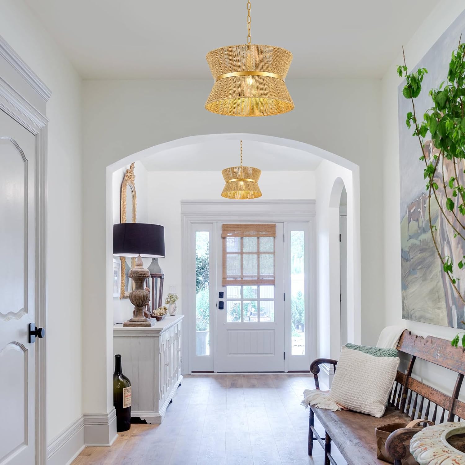 - Hand Woven Rattan: This boho pendant light features a rattan weaving technique that wraps around the entire light, complemented by brass-toned rings at the connecting points, giving the lamp a vibrant and sophisticated appeal.